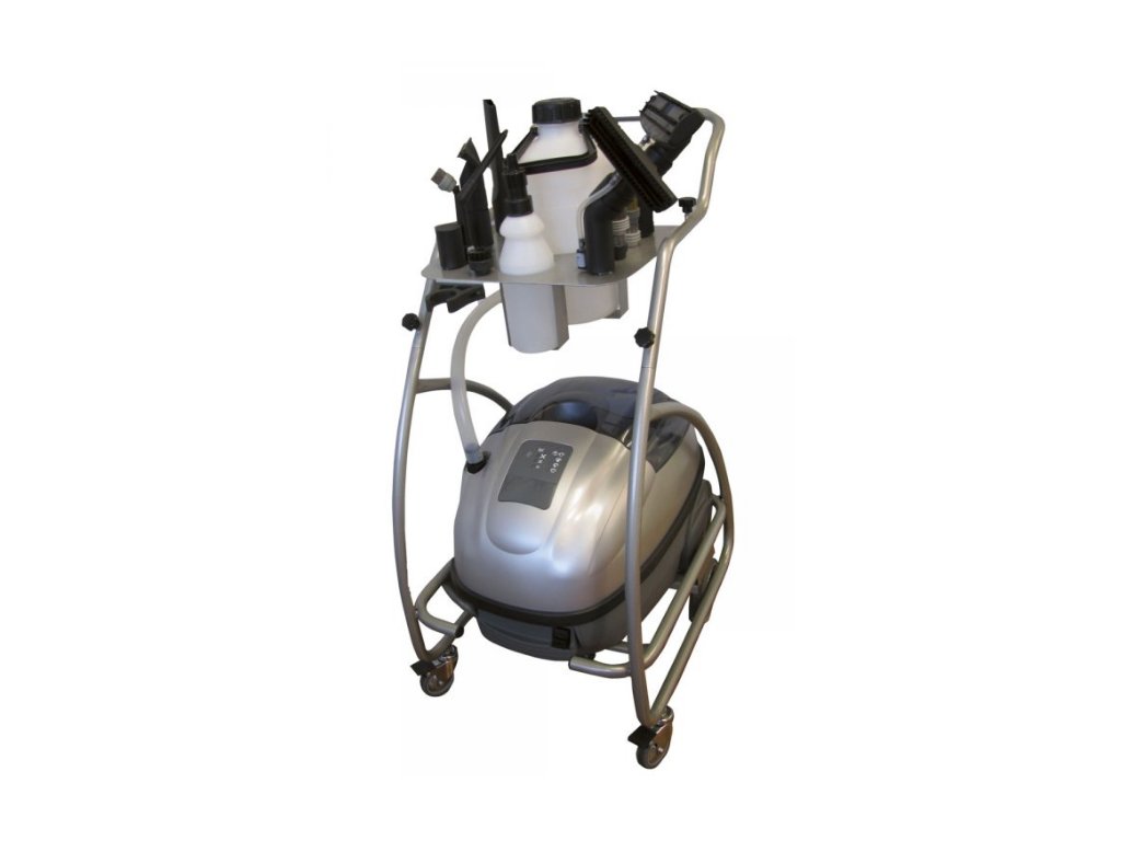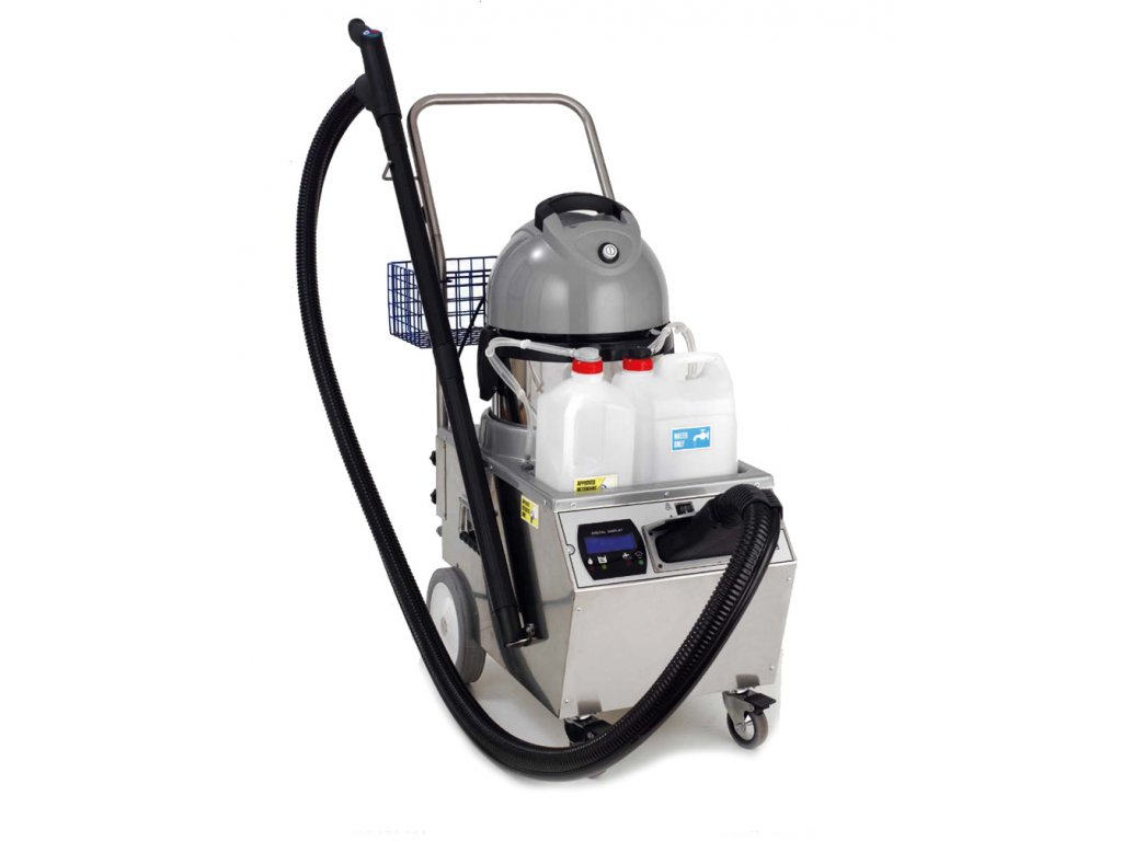 Profesionální parní čistič s tlakem 9 barů a průmyslovým vysavačem 1400W v nerezovém provedení. Funkce oplachu horkou vodou a přisávání detergentu v jednom stroji.